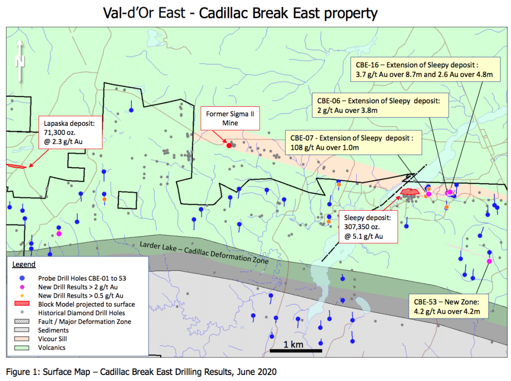 The Sleepy deposit, located at the northern end of the Cadillac Break East project, hosts inferred resources of 1.9 million tonnes grading 5.1 g/t gold for 307,350 oz.