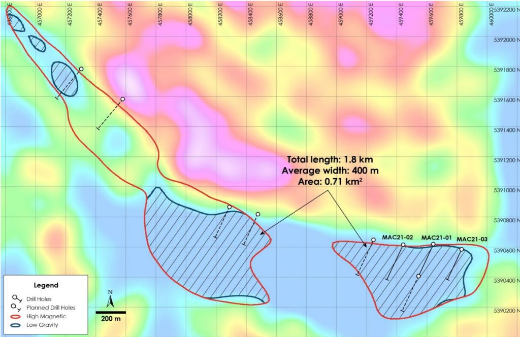 Canada Nickel describes the MacDiarmid ultramafic intrusion as being 3 km long and 150 to 600 metres wide. The three holes targeted a set of coincident geophysical anomalies along 1.8 km. The holes were collared 200 metres apart on the east side of the intrusion and were designed to intersect mineralization at right angles to the strike direction. Mineralization was defined across 400 metres of strike length to a maximum depth of 360 metres and widths of 150 to 200 metres.