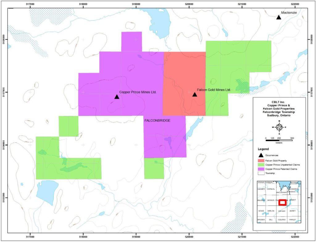 CBLT Inc. (TSXV: CBLT) purchased the former Falcon gold mine adjacent to its Copper Prince property along the Garson fault in Ontario’s Sudbury Basin. The Falcon property is sandwiched between CBLT’s three patented and its other unpatented Copper Prince claims.