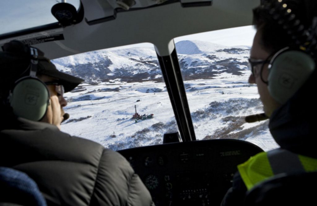 A bird’s eye view of drilling at the Pebble copper-gold project.[/caption]