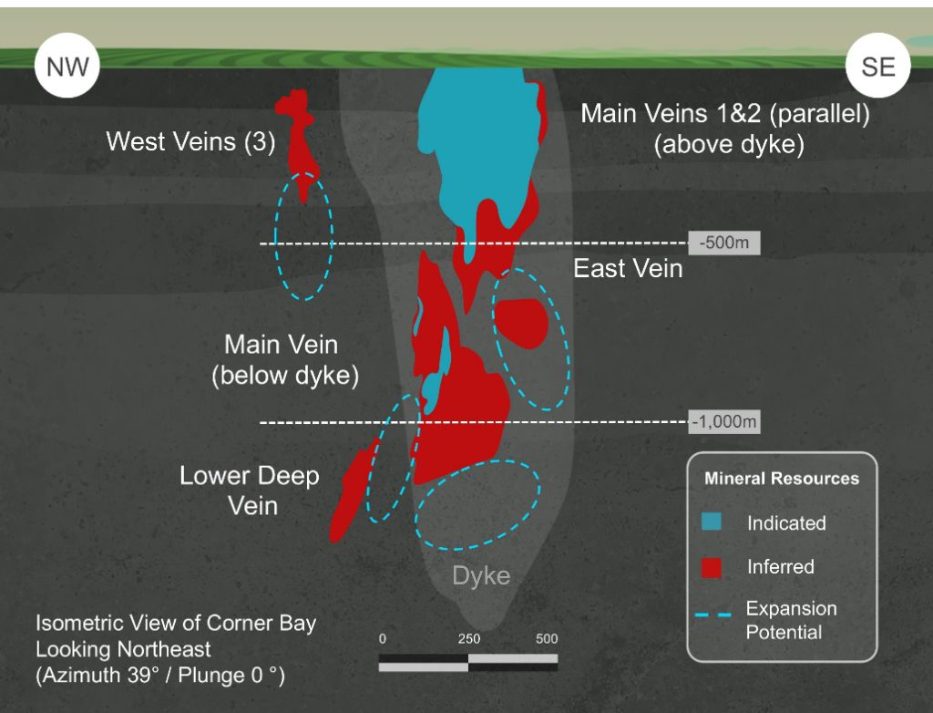 The Corner Bay deposit contains an indicated resource of 2.7 million tonnes grading 2.68% copper and 0.26 g/t gold and an inferred resource of 4.5 million tonnes at 3.2% copper and 0.27 g/t gold. The deposit contains 157 million lb. of copper in the indicated category and 320 million lb. of copper in the inferred category.