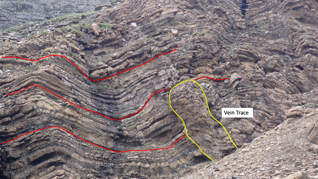 Float sample D-723639, taken at the 1,484-metre elevation, consisted of quartz carbonate with black graphic shale with abundant malachite and one to three percent chalcopyrite. This sample returned 1.3 % copper. Sample D-723640, taken 18 metres-vertical below that of above, consisted of 50% sheared siltstone and carbonate in a shear fabric with 50% carbonate and siltstone fragments contained 1% chalcopyrite and returned 0.5% copper.
