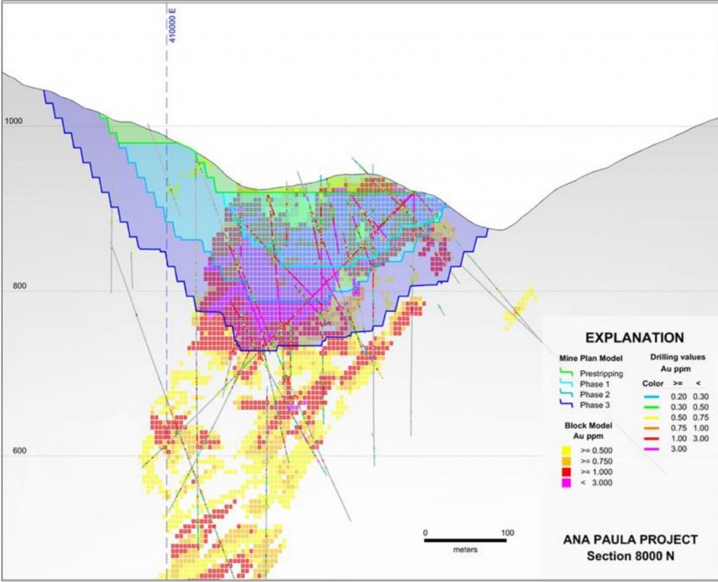 Cross-section of the Ana Paula deposit. Note the potential for underground development as well as open pit. (Credit: Alio Gold)[/caption]