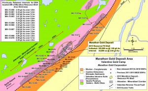 Marathon has estimated the four deposits in the Valentine gold camp to contain both open pit and underground measured and indicated resources of 14.99 million tonnes grading 2.20 g/t Au and containing 1.06 million oz of gold. There are also inferred resources of 2.18 million tonnes at 2.85 g/t Au.