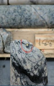 Visible gold in drill core from the Marathon deposit at the Valentine Lake project.[/caption]
