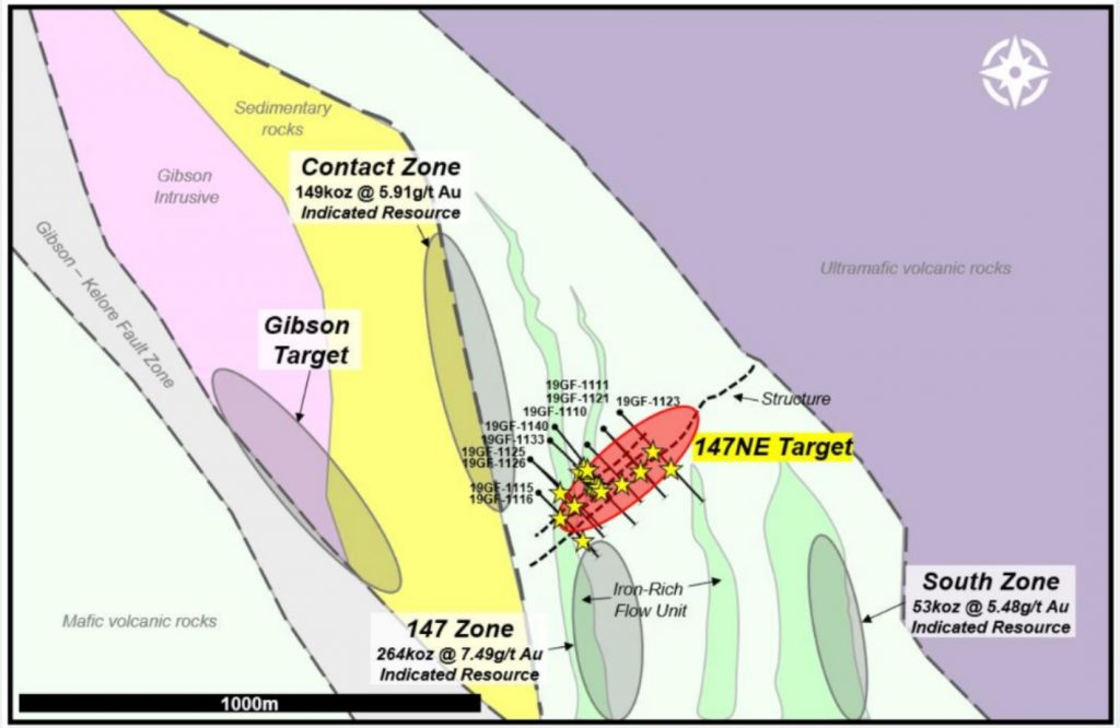 Drilling at the 147NE target of the Grey Fox area returned a best assay of 95.2 g/t gold over 0.9 metre. Other assays included 33.0 g/t gold over 3.1 metres, 47.4 g/t over 1.1 metre, 23.0 g/t over 1.8 metre, and 3.4 g/t over 36.8 metres.