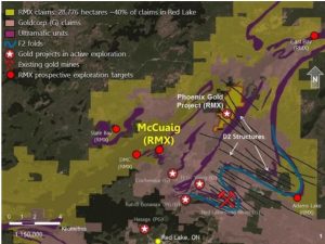 The McCuaig property is about 6 km southwest of the Rubicon’s Phoenix gold project. McCuaig includes three unpatented claims covering 126 hectares. Between 1997 and 2007, Rubicon surveyed, mapped and modeled the property as well as conducting 22,000 metres of drilling. Historically, drilling returned 15.65 g/t gold over 1.55 metre, 22.83 g/t over 3.10 metres (including 75.91 g/t over 0.70 metre), 25.48 g/t over 1.07 metres, and 18.08 g/t over 0.45 metres.