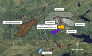 Drawing of the proposed site layout for the Eau Claire gold-silver deposit. (Image: Eastmain Resources)[/caption]
