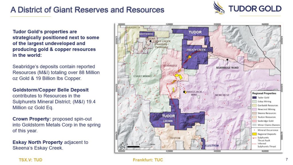 The prime company’s flagship project Treaty Creek (in which Tudor Gold has a 60% interest), comprises 17,913-hectares and borders Seabridge Gold’s KSM property to the southwest and borders Newcrest Mining’s Brucejack property to the southeast.