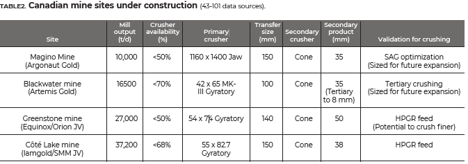 All the sites have sized the material handling equipment for later expansion opportunities. Utilizing 140- to 231-tonne haul trucks delivers lower operating costs, without the need for elaborate maintenance equipment. Three sites have incorporated gyratory crusher for primary crushing stages – to enable later expansion phases. The Magino site will utilize a jaw crusher, with the provision of a secondary cone crusher stage to provide optimal feed to the SAG mill. It is more common practice to utilize two stages of crushing ahead of any downstream option – SAG or HPGR, since the operational characteristics improve dramatically when controlling the top size to any mill circuit.