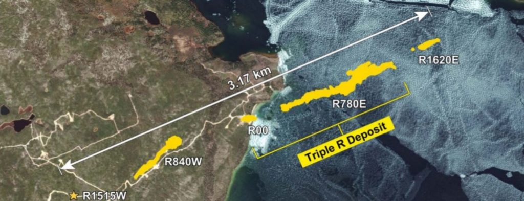 The uranium mineralization at PLS Trends fore than 3 km, but resources have been estimated for only the Triple R deposit. Credit: Fission Uranium.[/caption]