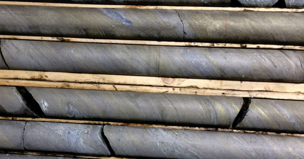 Whole dry core showing banded and replacement pyrite, sphalerite, galena and chalcopyrite from the Pickett Mountain property in Maine. (Image: Wolfden Resources)[/caption]